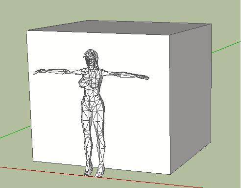 Na początek uruchamiamy Google sketchup i z menu file wybieramy import. W okienku: typy plików wybieramy format 3ds i importujemy wcześniej przygotowaną postać z GTA. Posłuży nam ona jako miara wielkości obiektu. Bez niej po dodaniu obiektu do gry mógł by się on okazać albo za duży albo za mały. Na początek w celach naukowych stwórzmy prosty sześcian. Powinno wyjść wam mniej więcej coś takiego: